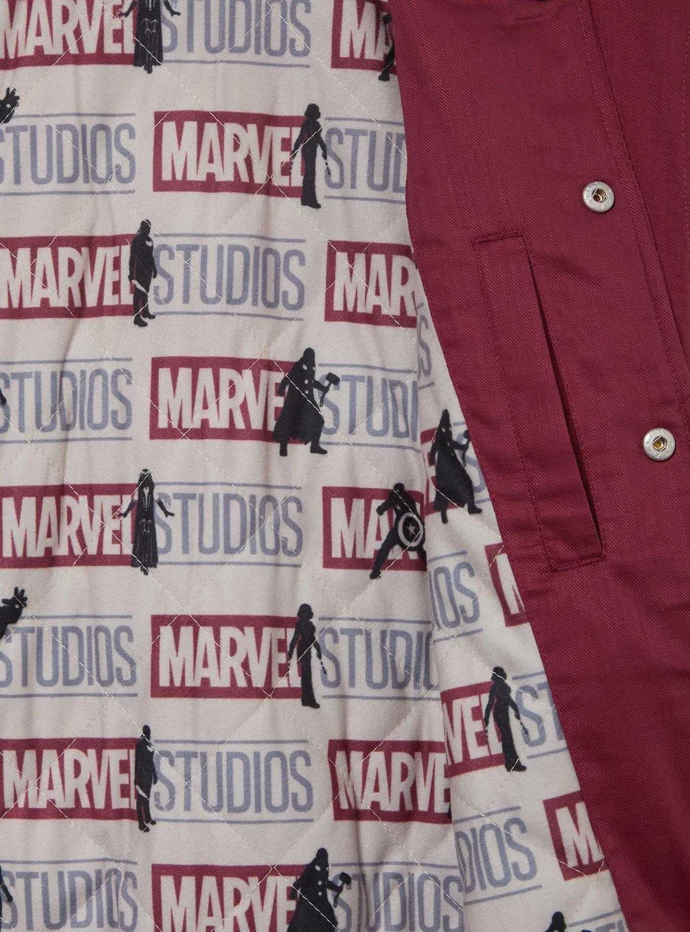 Rep your favorite studio with this Marvel varsity jacket! As part of BoxLunch’s 10th anniversary collection, this jacket features detailed embroidery of the studio name, logos, and silhouettes of Iron Man. With a multi-character print tucked on the inside, this jacket is an essential piece for any fan.