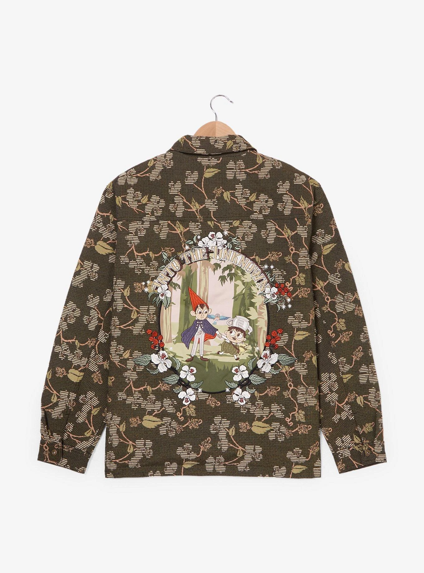 Explore the forest in this Over the Garden Wall jacket! Featuring a woven allover design of vines and flowers, the front includes the show’s title embroidered. With an embroidered patch of Wirt and Greg among flowers and “Into the Unknown” lettering on the back, this jacket includes a zippered closure and pockets.